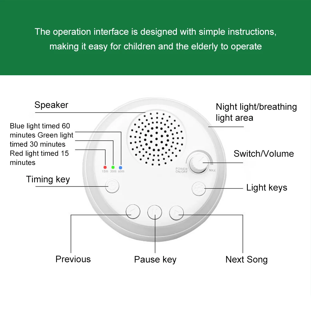 Customizable Sound: Users can add and customize their favorite songs in addition to the 16 built-in soothing tracks, including white noise and mood music, on this white noise machine